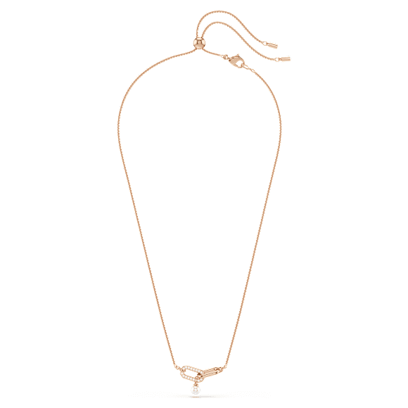 Εκφράστε την απόλυτη κομψότητα με αυτό το μενταγιόν με επιμετάλλωση σε ροζ χρυσό τόνο. Περασμένο σε λεπτεπίλεπτη αλυσίδα, το κεντρικό μοτίβο αποτελείται από δύο συνδεδεμένους κρίκους, εκ των οποίων ο ένας είναι διακοσμημένος με διαφανή κρύσταλλα pavé και ένα Swarovski Crystal Pearl που κρέμεται από κάτω. Εκτός από το κούμπωμα με ρεζέ, το μενταγιόν διαθέτει επίσης μηχανισμό έλξης για ρυθμιζόμενη εφαρμογή. Για αρμονικό στυλ, συνδυάστε το με ασορτί σκουλαρίκια ή βραχιόλι από την ίδια οικογένεια.