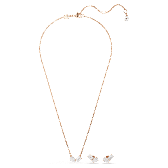 Συνθέστε εμφάνιση απόλυτης κομψότητας με αυτό το ασορτί σετ με μενταγιόν και σκουλαρίκια Mesmera. Τα εντυπωσιακά κομμάτια διαθέτουν επιμετάλλωση σε ροζ χρυσό τόνο και το καθένα περιλαμβάνει ένα ζευγάρι Swarovski Zirconia κοπής pear και οκταγωνικής βαθμιαίας κοπής σε οδοντωτό δέσιμο. Απλό αλλά εκλεπτυσμένο, αυτό το σετ αποτελεί το ιδανικό δώρο για κάθε ξεχωριστή περίσταση.