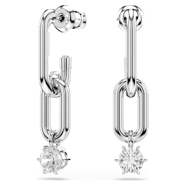 These playful earrings are a perfect choice for unexpected styling. Each piece features two interconnecting links in rhodium plating with a prong-set Swarovski Zirconia that delicately hangs beneath. It’s a sleek, metallic look for any occasion, with an extra burst of Swarovski light.