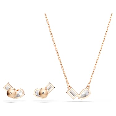 Create a look of overall elegance with this matching Mesmera pendant and earrings set. The eye-catching pieces are rose gold-tone plated and each feature a pair of prong-set Swarovski Zirconia in pear and octagon-step cuts. Simple yet refined, this set makes a perfect gift for any special occasion.