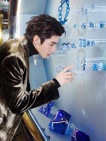 Actor, singer, and local Swarovski ambassador in Thailand, Blue Pongtiwat dialed up the glamour attending the launch party for Masters of Light – Hollywood in a tailored velvet suit accessorized with Millenia necklaces and Matrix brooches, bracelet, ear cuffs, and ring.