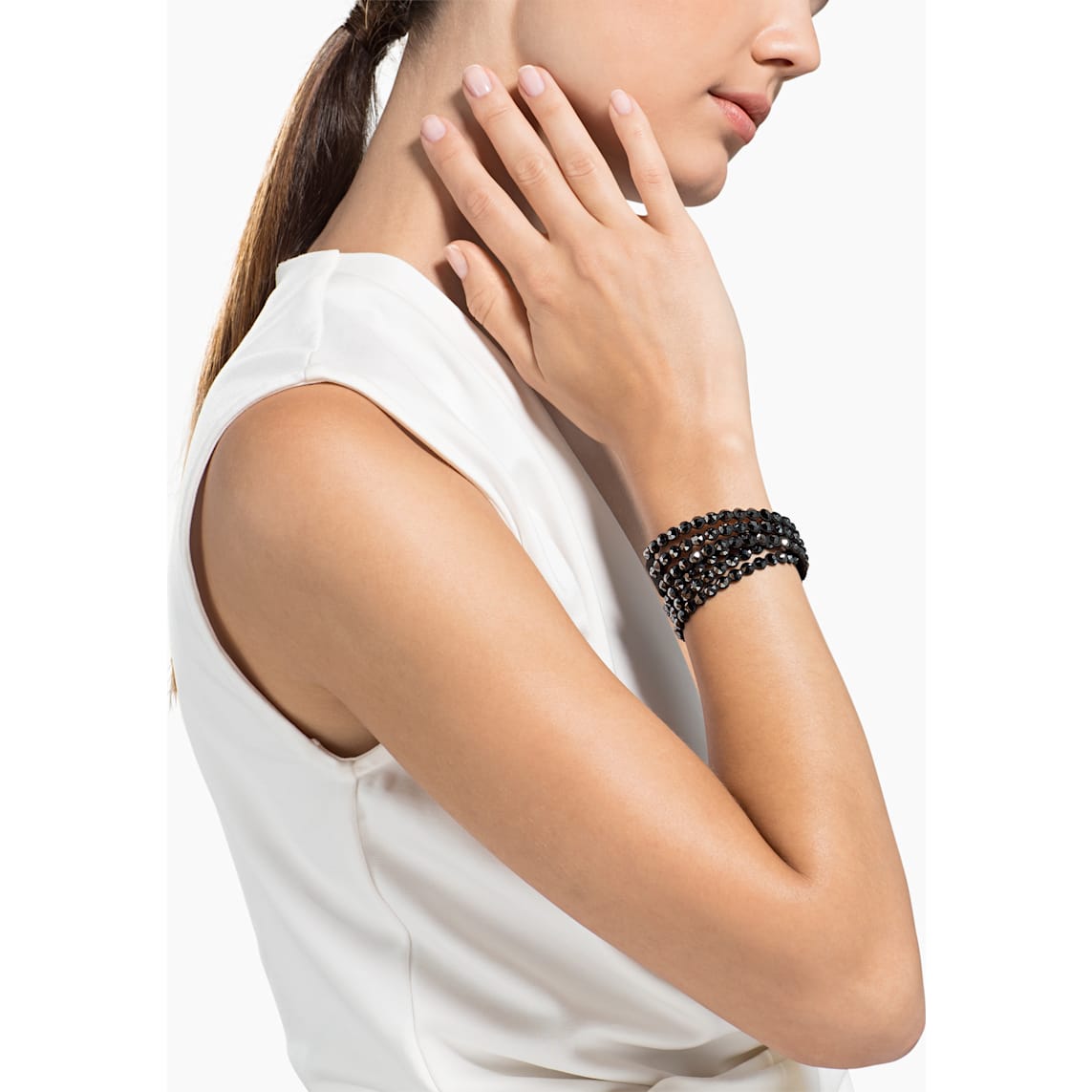 This must-have design sparkles brilliantly with black crystals on soft black Alcantara® fabric, with an adjustable closure featuring a Swarovski swan-shaped button. Wear it solo, as a choker, or stacked with other Swarovski Power Collection bracelets to create your own arm party.