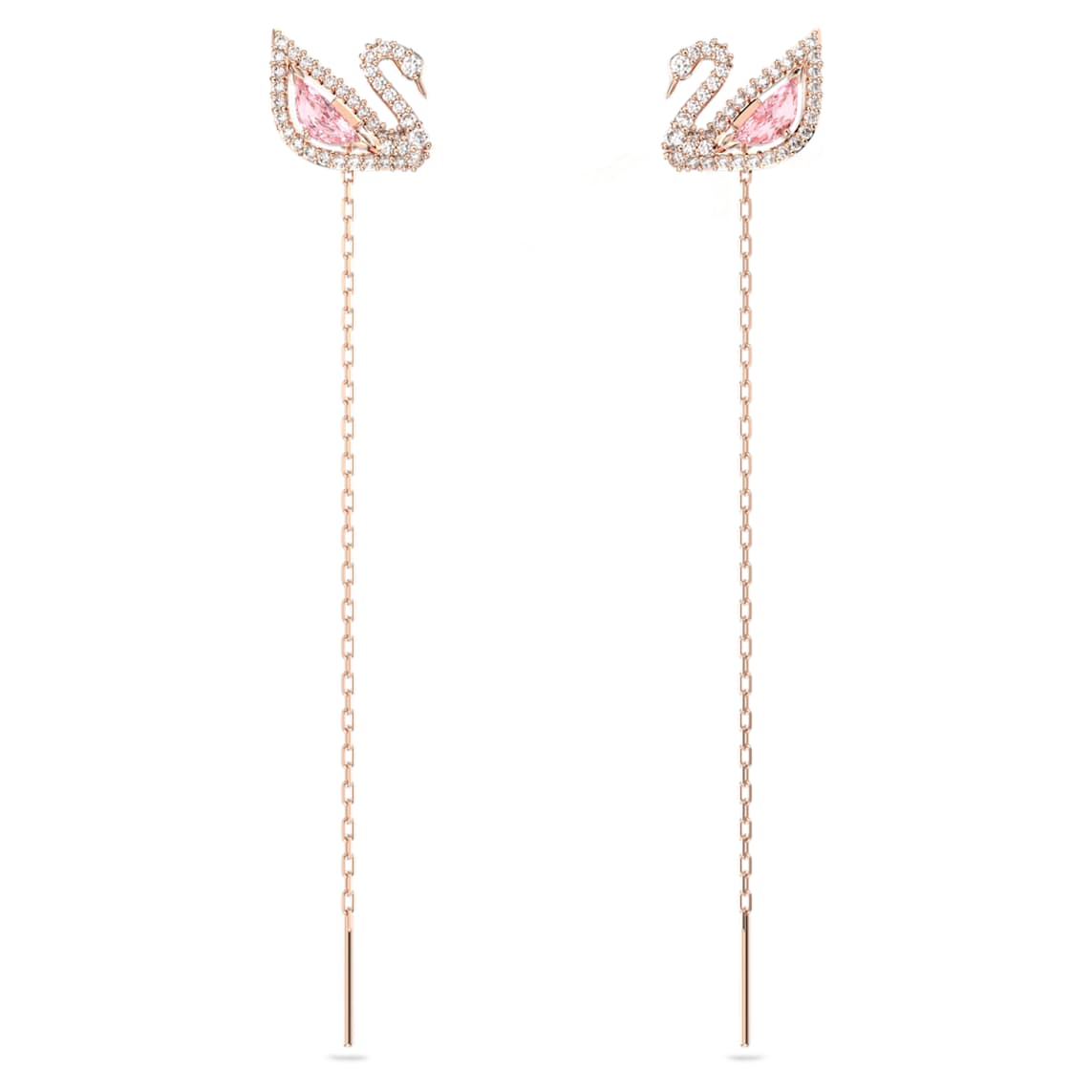 Enjoy multiple looks with this dazzling pair of versatile long-length pierced earrings. The iconic swan motif shines with a full-cut crystal body in cool millennial pink and crisp clear pavé lines. Wear as simple studs, or attach one, or both, of the delicate rose gold-plated chains for more statement style. A dainty design that will undoubtedly add cool and romantic style to your everyday collection. Matching items are available.