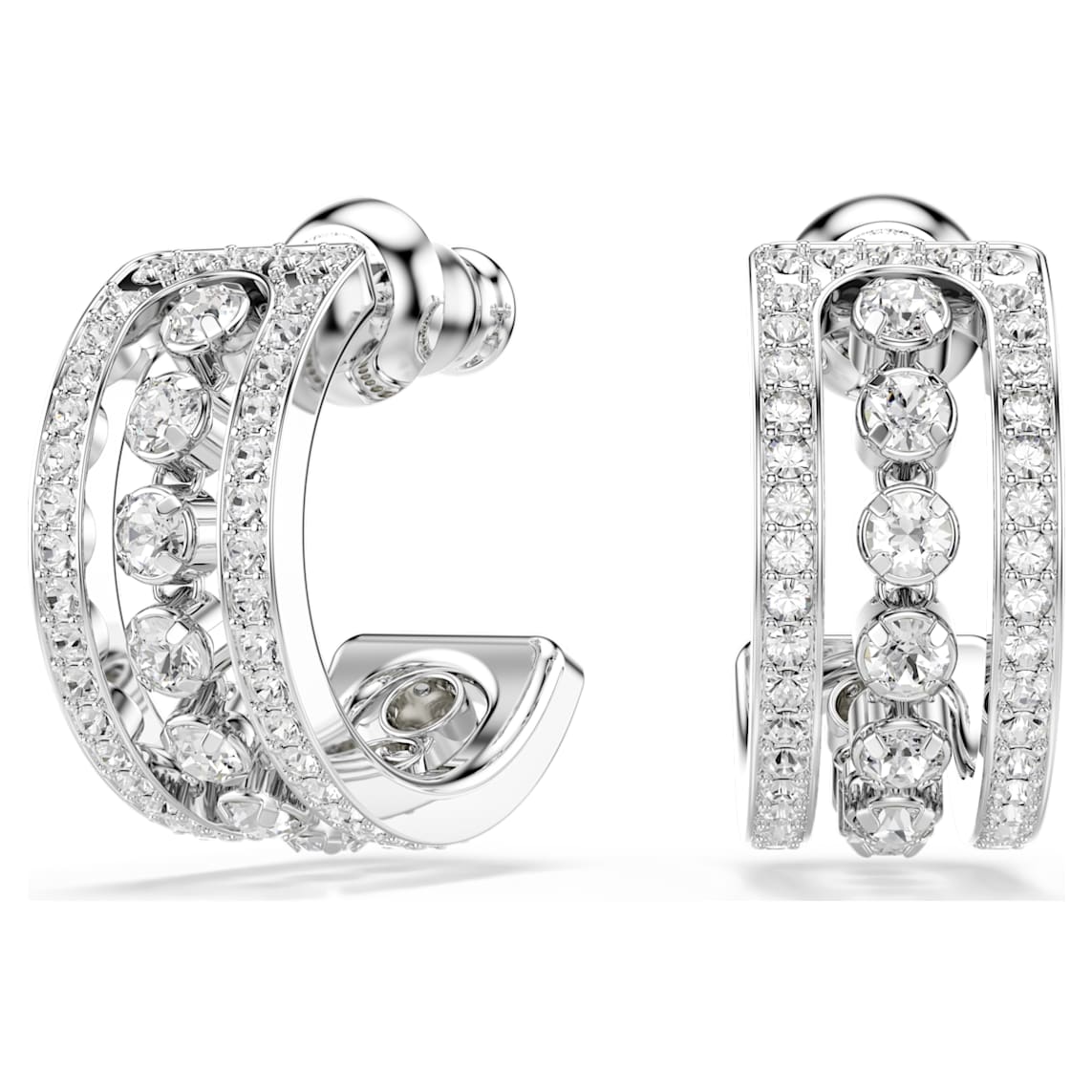 Swarovski have created another pierced earring essential for your jewelry box with these small but perfectly formed hoops. Crafted in rhodium-plated metal, they feature a refined line of clear crystal in a cupchain setting, bounded by lines of clear pavé. Full of cool and romantic sparkle, they offer a modern take on a refined and timeless aesthetic.