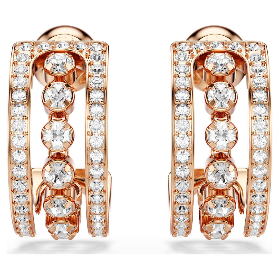 Swarovski have created another pierced earring essential for your jewelry box with these small but perfectly formed hoops. Crafted in rose gold-plated metal, they feature a refined line of clear crystal in a cupchain setting, bounded by lines of clear pavé. Full of cool and romantic sparkle, they offer a modern take on a refined and timeless aesthetic.