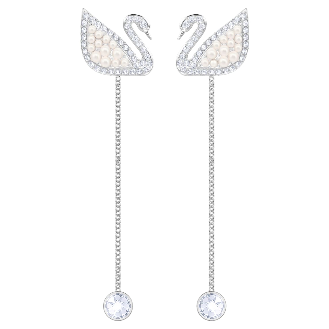 Turn heads in these long-length versatile pierced earrings. Crafted in rhodium-plated metal, our iconic swan motif shines with white micro Crystal Pearls and elegant lines of clear pavé. Dangling chain elements, punctuated with clear crystals, add another dose of glamour. Wear as simple swan studs or go all out with the chains. Timelessly elegant and feminine.