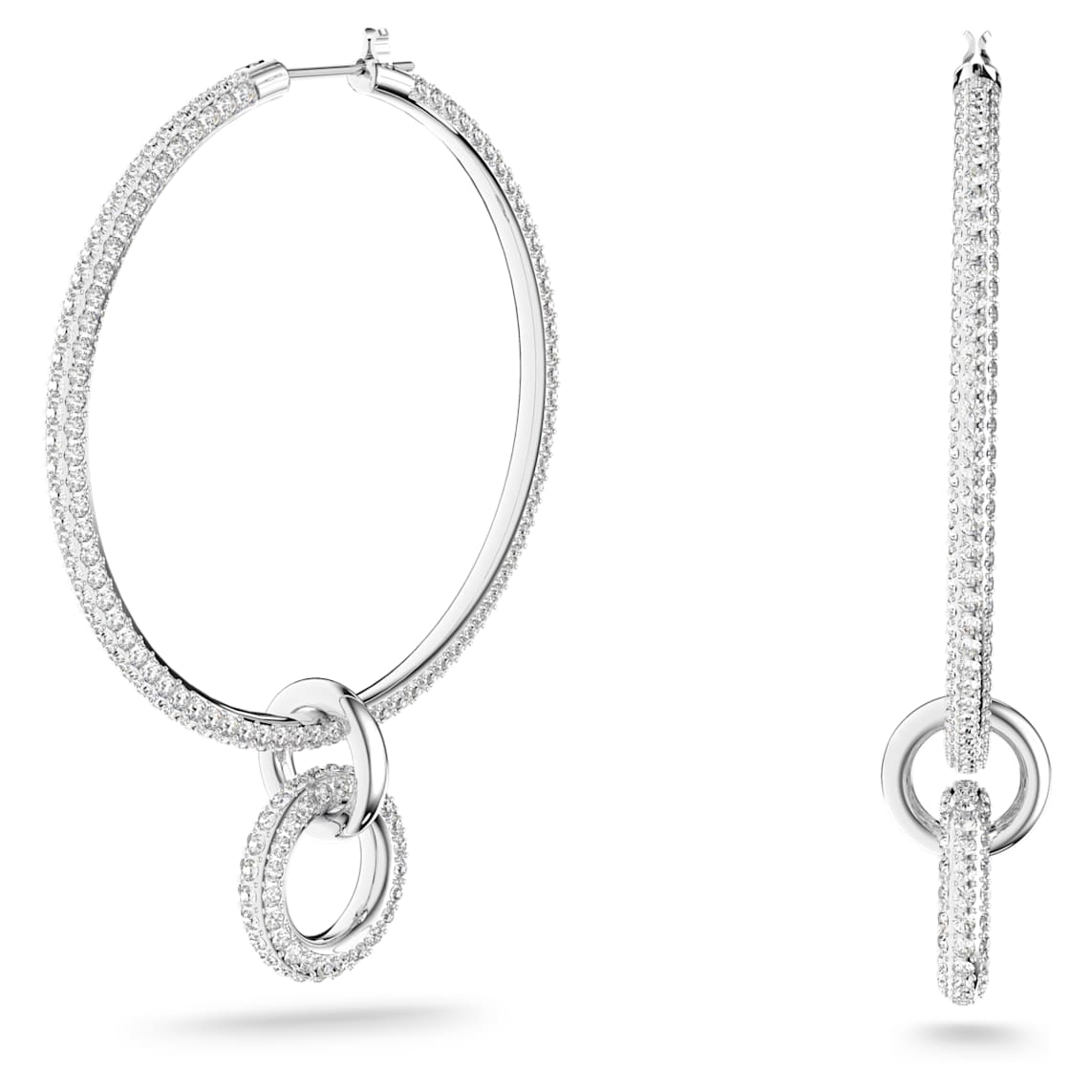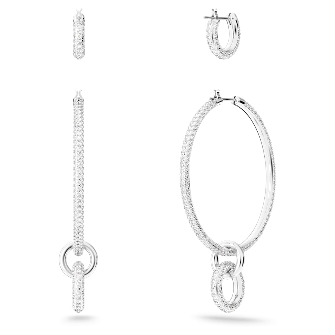 Forget your signature look and opt for limitless possibilities with this versatile pierced earrings set. Plated in rhodium and sparkling with clear crystal pavé, this ensemble will allow you to enjoy up to six symmetrical looks and an infinite number of asymmetrical styles. From oversized hoops on a night out to subtle loops on the beach, you will never tire of this contemporary collection.