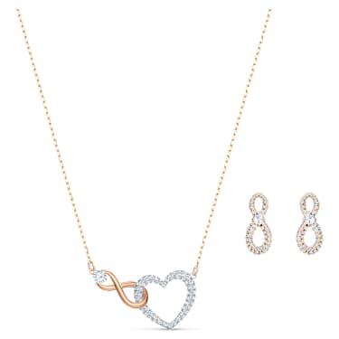 永遠の愛を感じて。ロマンチックな魅力にあふれるミックスメタル仕上げのピアスとネックレスのセット。ピアスには無限のシンボルを思わせるシェイプを取り入れ、ネックレスには同じシンボルとハートをからませました。どちらにもホワイトクリスタルをあしらい、光を受けるたびに美しいきらめきを見せるデザインに仕上げています。さらに大粒のホワイトクリスタルを加えて輝きをプラスしています。ロマンチックなシーンでのギフトにも最適です。