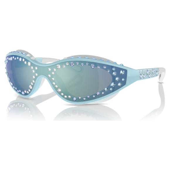 Imber에서 영감을 받은 이 선글라스로 활기 넘치는 스타일에 뛰어들어 보세요. 이 스포티한 디자인은 스위밍 고글의 유선형 형태를 기반으로 하며 다양한 블루 및 클리어 크리스털로 장식된 혁신적인 블루 플라스틱 프레임, 템플, 블루 미러 렌즈가 특징입니다. 고무를 입힌 템플 팁과 아이 패드 등의 세심한 처리가 기쁨을 더해줍니다. 룩을 생기 있게 표현하는 유쾌하고 화려한 방법입니다.