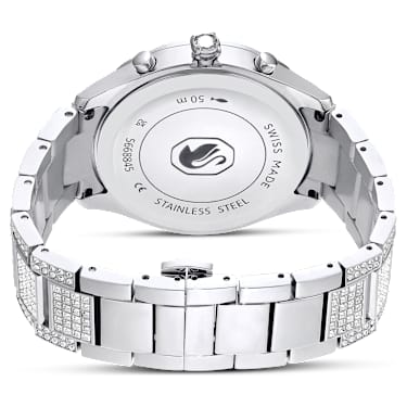 Swarovski의 savoir-faire를 진정 눈부시게 보여주는 이 Dextera 워치는 모든 시간에 광채를 불어넣습니다. 40mm 스테인리스 스틸 케이스는 빛을 반사하도록 커팅된 크리스털 베젤이 돋보입니다. 가장 놀라운 점은 크로노그래프 다이얼이 라운드 컷 크리스털 240개와 분 카운터, 초 카운터, 시 카운터로 이루어진 서브다이얼 3개로 장식되어 있다는 것입니다. 광채를 극대화하기 위해 인덱스 마커를 개별 크리스털로 표시하고 시계침을 밝은 루미노바(Luminova)로 코팅하였습니다. 케이스 자체는 크리스털 40개로 덮여 있으며 크라운에 싱글 크리스털이 세팅되어 있고 스테인리스 스틸 브레이슬릿은 총 492개의 크리스털로 장식되어 있습니다. 이 스위스 메이드 워치는 50m 방수 기능을 갖추고 있으며 즐거운 화려함을 보여줍니다.