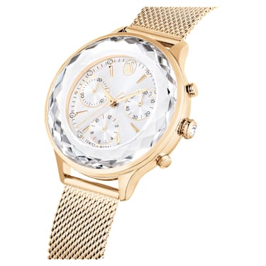 Epitomizing sports luxe style, this Nova watch is meticulously crafted to highlight Swarovski’s mastery of design. The 37mm stainless steel case has a champagne gold-tone finish and is seamlessly integrated with a beautifully faceted crystal bezel, as well as the watch’s sapphire glass. This frames the radiant sunray dial, which is adorned with a swan logo, crystal index markers, and three subdials including a minutes counter, seconds counter, and hours counter. Around the wrist, this modern timepiece is worn on a quick-release Milanese bracelet. The champagne gold-tone hands are coated in Luminova for added brilliance. This Swiss made watch is water resistant to 50 meters, with a single crystal set in the crown, and is a versatile choice for both work and play.