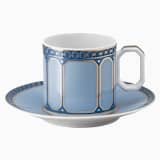 Uatrakcyjnij chwile spędzone przy kawie dzięki tej zachwycającej filiżance do espresso ze spodkiem z rodziny Signum. Podstawą zdobiącego ten zestaw motywu geometrycznego w kolorze zielonym jest charakterystyczny dla marki Swarovski kształt ośmiokąta z obramowaniem w odcieniach złota, a całości dopełnia artystycznie wykonane, ośmiokątne ucho. Projekt filiżanki powstał w ramach współpracy z producentem porcelany Rosenthal. Dodaj dzbanek do kawy i dzbanuszek do śmietanki, by skompletować zestaw. Można myć w zmywarce.