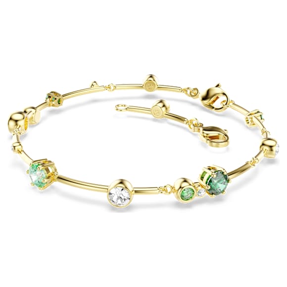 Envolva o seu pulso em luz com esta vibrante pulseira Constella. A silhueta com revestimento em tom dourado apresenta elos articulados intercalados com cristais e Swarovski Zirconia de vários tamanhos. Inclui uma mistura vibrante de tons verdes e incolores, cada um apresentado num engaste de garras ou em bisel. Juntamente com um mosquetão lagosta, a pulseira inclui um extensor adicional para permitir uma utilização versátil.