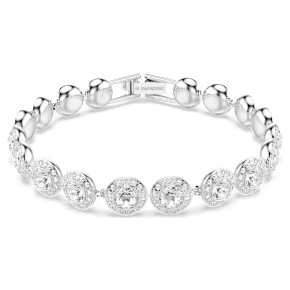 Bu parlak Una Angelic bilekliği kullanarak bileğinizi ışıkla sarmalayın. Rodyum kaplama tasarım, orta kısmında ışıltılı bir kristal ve daha küçük yuvarlak kesimli kristallerden oluşan bir haleyle tamamlanan bireysel bağlantı halkalarını ön plana çıkarıyor. Aynı ailedeki uyumlu parçalarla birlikte kullanılabilen büyüleyici zarafete sahip bir seçim.