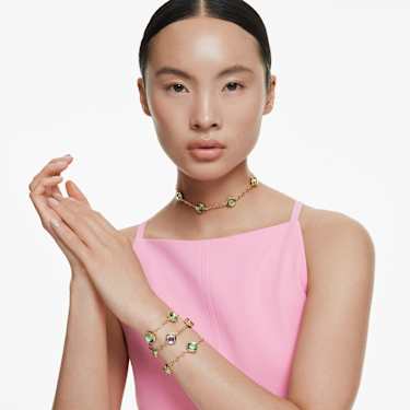 這款充滿歡樂氣息的 Chroma Twist 項鏈,讓您擁有一件抵多件的百變珠寶。鍍金色調掛鏈一面飾有綠色 Swarovski ReCreated™ 水晶,另一面則是充滿活力的粉紅色 Swarovski 水晶。只要翻轉水晶,就能搭配心情或服裝。可以利用磁扣鎖扣打造長項鏈、領口長度項鏈或頸鏈,或者創造五種不同長度的手鏈。具備如此多變特性,為自我表達提供了無限可能。Chroma Twist 系列珠寶含有至少 50% Swarovski ReCreated™ 水晶,是我們第一個在設計時即考慮循環利用的系列。